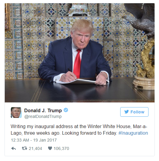 Trước khi nhậm chức hai ngày, Donald Trump đã đăng tải một bức ảnh lên Twitter với chú thích: "Đang viết phát biểu nhậm chức tại Nhà Trắng Mùa Đông, Mar-a-Lago, cách đây 3 tuần. Chờ mong tới thứ Sáu. #Nhậm_chức". Tuy nhiên Nhà Trắng lại nói rằng, bài phát biểu của ông Trump lại không phải hoàn toàn do ông viết. Hai trong số các cố vấn hàng đầu của ông, stephen miller và Steve Bannon đã viết nên bài phát biểu này.
