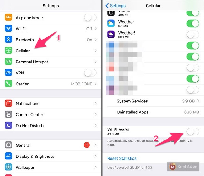 Đầu tiên, bạn đọc truy cập vào Setttings / Cellular, sau đó kéo xuống dưới cùng bạn sẽ nhìn thấy tính năng Wi-Fi Assist. Nếu thấy nó đang ở chế độ ON, thì bạn nên nhanh chóng tắt nó đi. Đồng thời, bạn sẽ thấy phần hiển thị dung lượng "49 MB" như trong hình, đây chính là dung lượng 3G/4G mà bạn sẽ tiêu tốn khi bật tính năng này.