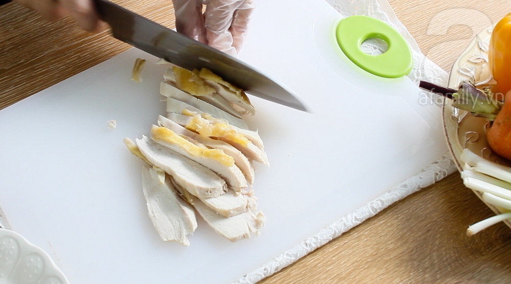 Thịt gà lóc xương ra, cắt miếng vừa ăn.