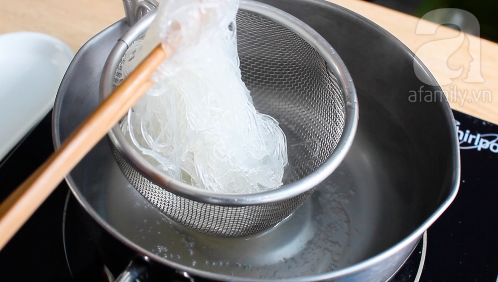 Cho miến vào nồi nước sôi, trụng nhanh vớt ra. Không nên trụng chín quá.