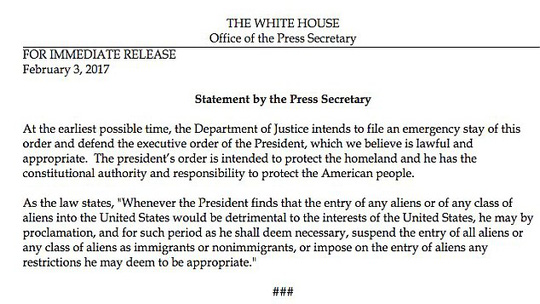 Trong thông báo thứ nhất do Thư ký báo chí Nhà Trắng Sean Spicer đưa ra vào lúc 22 giờ 5 phút (giờ địa phương), phán quyết của thẩm phán Robart bị gọi là "phán quyết sỉ nhục".