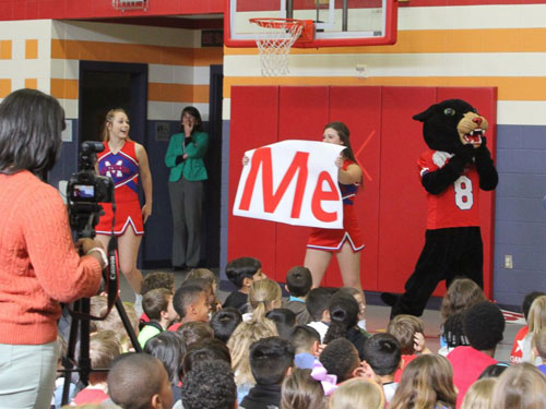 Bạn trai của cô Mandy, Russ Johsnon, đã dàn dựng buổi tập trung này vào ngày 26/1 để cầu hôn tình yêu của đời mình trong khi đang mặc bộ đồ con báo, tại trường tiểu học Castleman ở Texas.