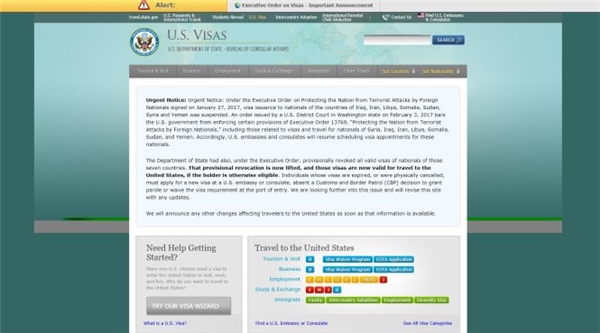 Thông báo trên trang web của Bộ ngoại giao Mỹ về việc đình chỉ sắc lệnh cấm nhập cảnh của Tổng thống Donald Trump.