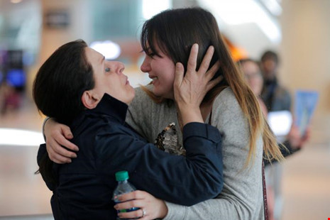 Mẹ vui mừng đón con gái từ Iran sang ngày 6-2 tại Boston (Massachusetts, Mỹ), sau khi Thẩm phán James L. Robart ra lệnh tạm thời ngưng thực hiện sắc lệnh cấm dân 7 nước Hồi giáo nhập cảnh vào Mỹ của ông Trump. Ảnh: REUTERS