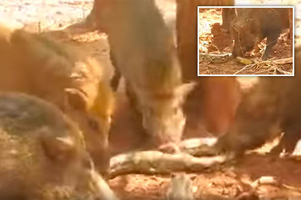 Đàn lợn rừng xé xác trăn khổng lồ.