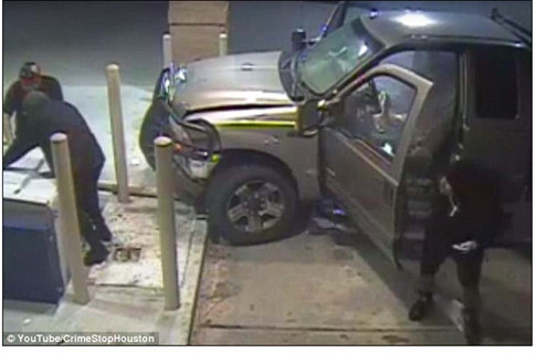 Tổ chức CrimeStopHouston nói: “3 người đàn ông da trắng sử dụng chiếc xe bán tải ăn cắp Tan Ford F250 để húc vào một trụ ATM của một ngân hàng ở đường Greens, thành phố Houston, bang Texas. Sau đó, 3 nghi phạm bước ra khỏi xe và sử dụng một cây xà beng để cạy ATM. Sau nhiều lần cạy mà ATM vẫn trơ trơ, các nghi phạm chạy bộ thoát khỏi hiện trường”.
