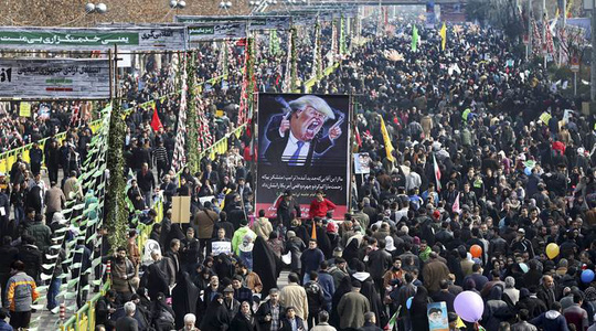 Cũng trong ngày 10-2, hàng trăm ngàn người đổ về Quãng trường Azadi, thủ đô Tehran – Iran để tuần hành phản đối ông Trump. Đoàn người biểu tình mang theo biểu ngữ chỉ trích Mỹ và hình nộm ông Trump. Những người biểu tình dẫm đạp lên hình ảnh của ông Trump, giương cao cờ Iran trong lúc hô vang khẩu hiệu chống tân tổng thống Mỹ.