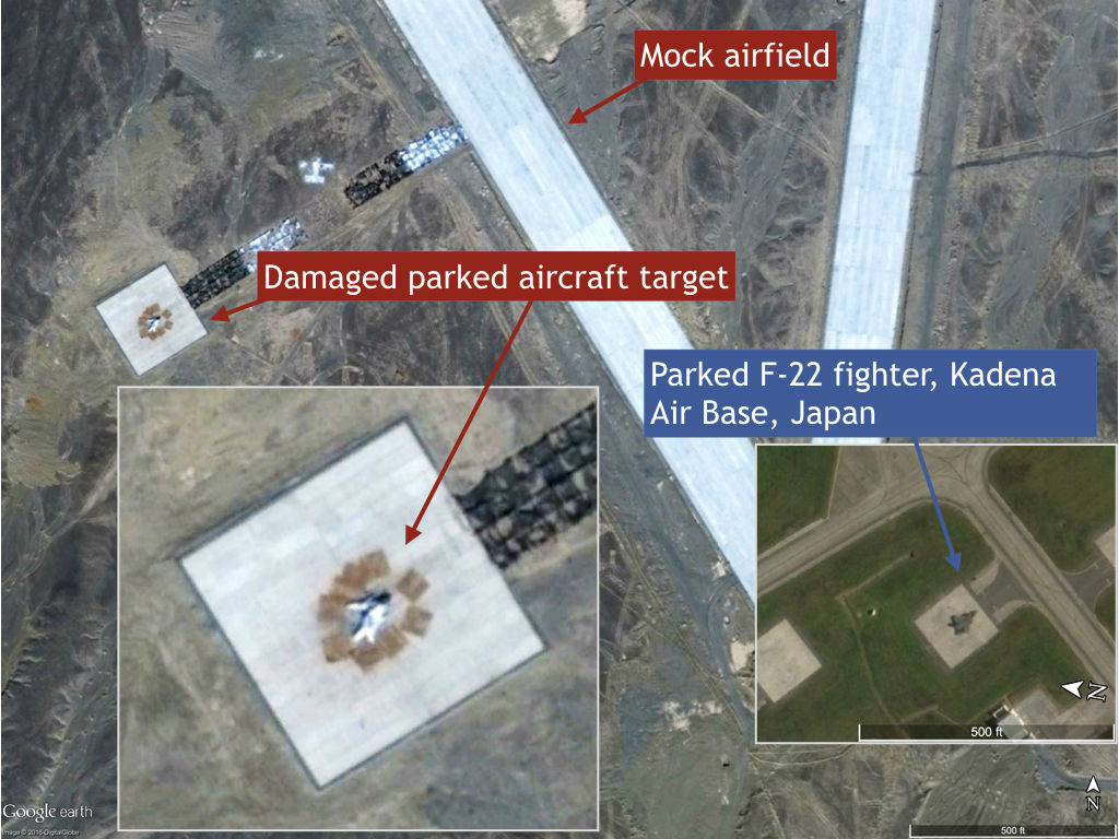 Những năng lực này có thể được thử nghiệm ở nơi thử hiệu ứng của tên lửa đạn đạo ở rìa sa mạc Gobi miền Tây Trung Quốc. Các hình ảnh từ vệ tinh cho thấy một loạt các mục tiêu thử nghiệm đại diện cho các mục tiêu trong học thuyết đã thảo luận bên trên, bao gồm các phương tiện, các máy bay đỗ bên ngoài, các kho chứa nhiên liệu, đường băng, các trung tâm điện lực, và việc vận chuyển đạn dược vào tới các kho chứa và hầm ngầm.