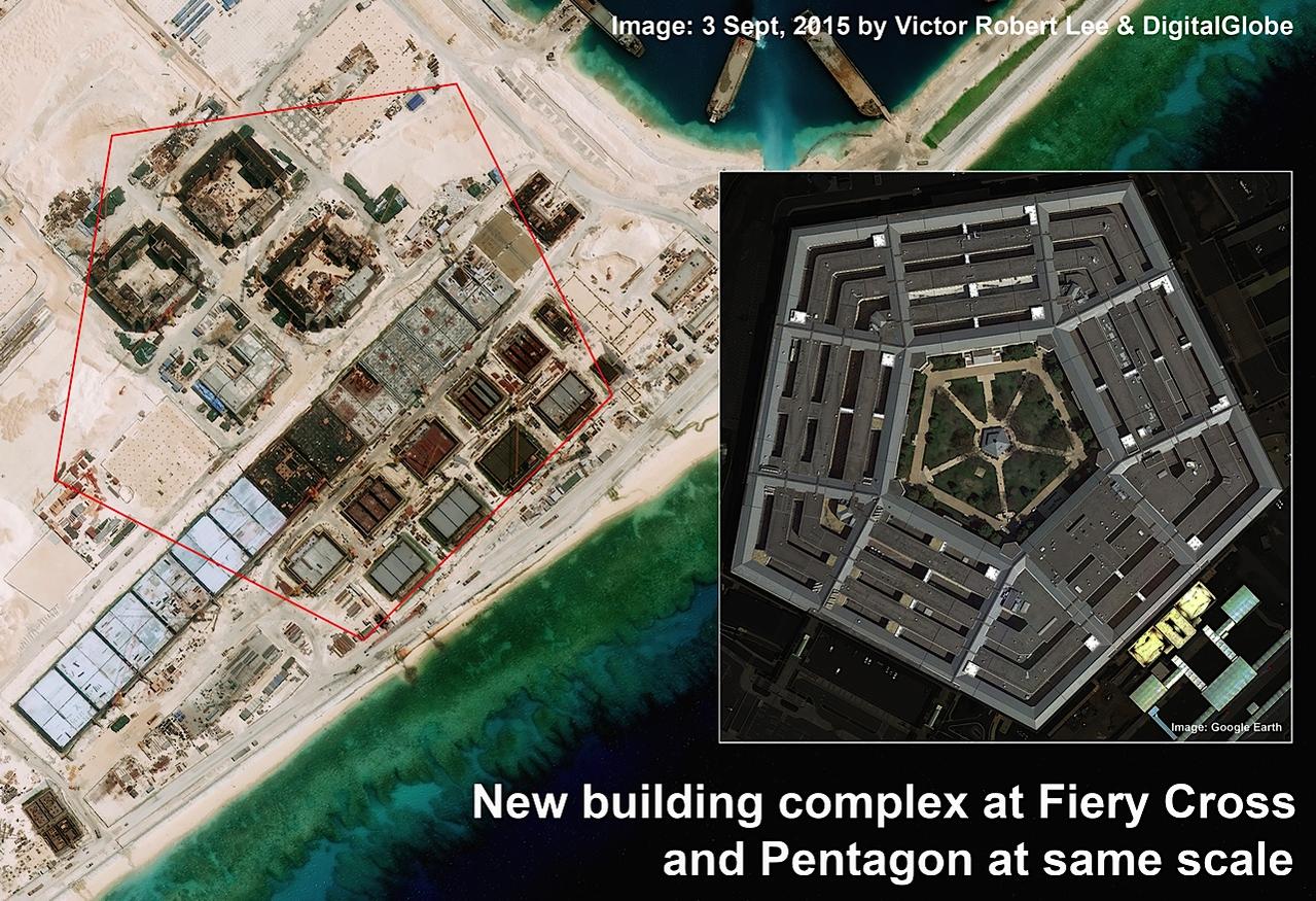 Cận cảnh Đá Chữ Thập đã bị Trung Quốc bồi lấp, xây đảo nhân tạo trái phép với đường băng và các nhà chứa máy bay, được so sánh với Lầu Năm Góc của Mỹ