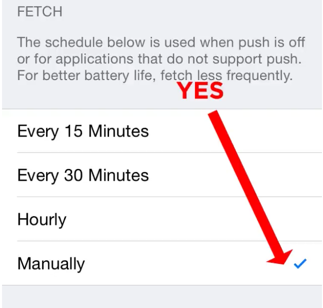 Thay vì để iPhone tự động nạp các cập nhật mới liên quan đến thư, lịch năm hay danh bạ liên tục, hãy chuyển sang chế độ thủ công để tiết kiệm pin.