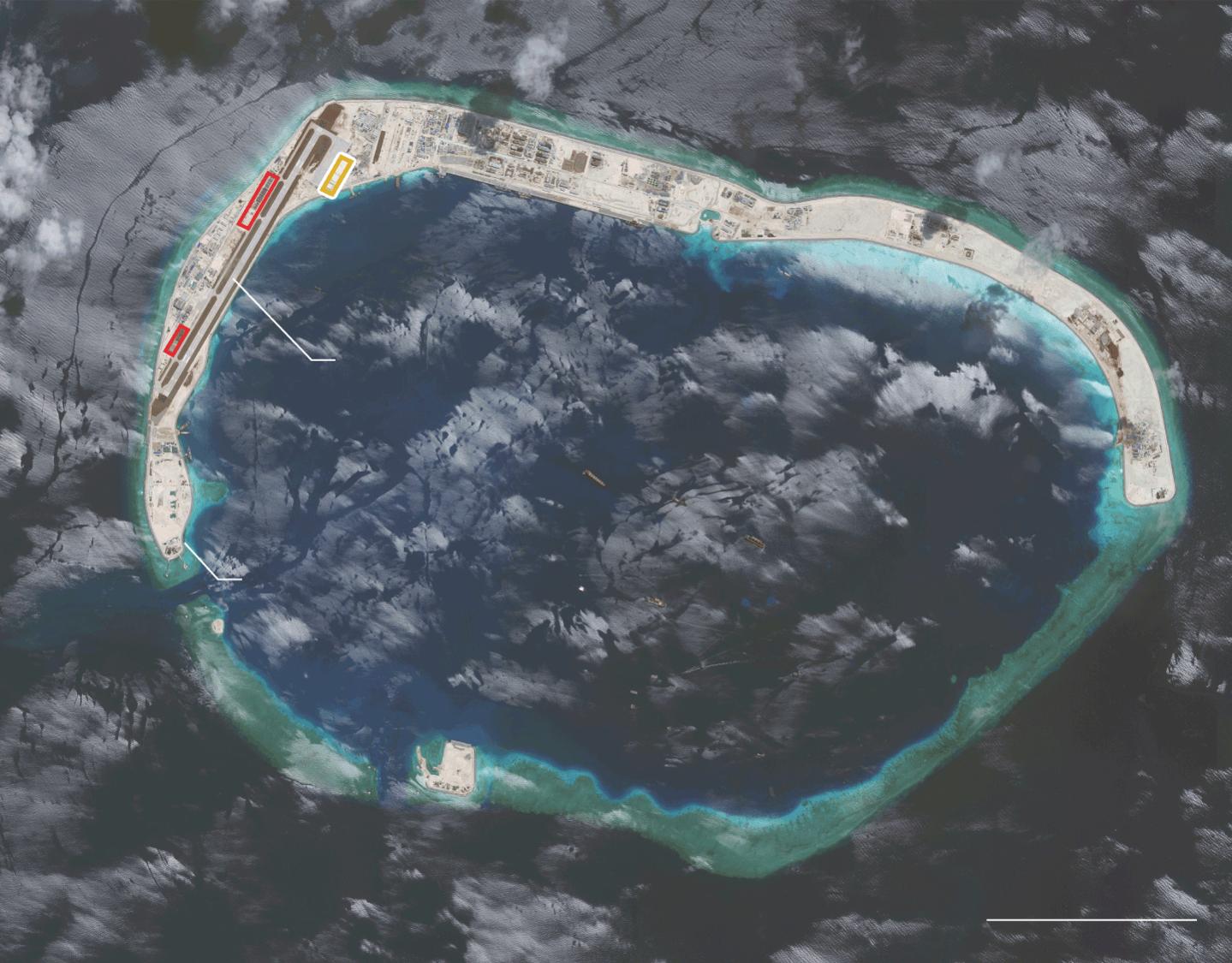 Cận Đá Vành Khăn đã bị Trung Quốc bồi lấp, xây đảo nhân tạo trái phép với đường băng và các công trình quân sự kiên cố
