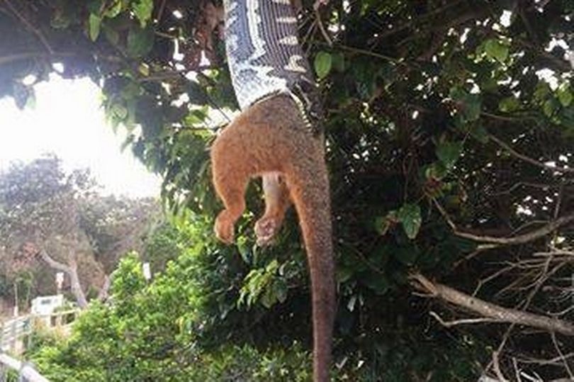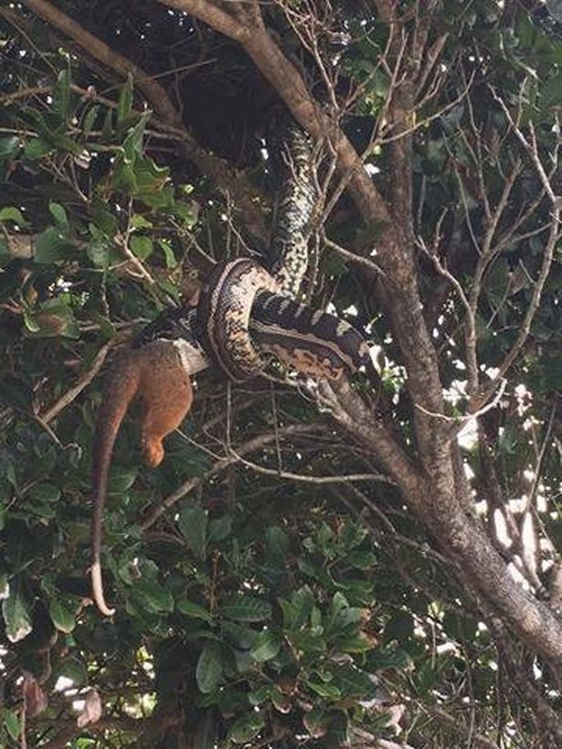 Một con trăn Carpet khổng lồ vừa bị bắt gặp treo lủng lẳng trên cây và nuốt sống một con chồn Oposum, loài thú có túi nổi tiếng ở Úc.