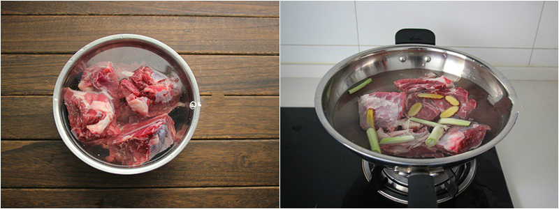 Thịt mua về rửa sạch sau đó cho vào nồi, đổ ngập nước cùng với hành baro cắt khúc, gừng cắt lát mỏng rồi bắc lên bếp luộc sơ.