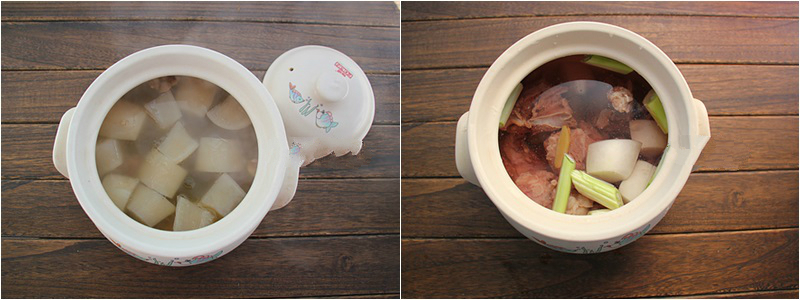 Vớt bò ra cho vào nồi hầm cùng với củ cải cắt khối vuông 2-3cm, gừng, hành baro, rượu nấu ăn trong khoảng 15 phút thì tắt bếp. Các bạn nhớ vớt bọt để nước dùng được trong nhé!