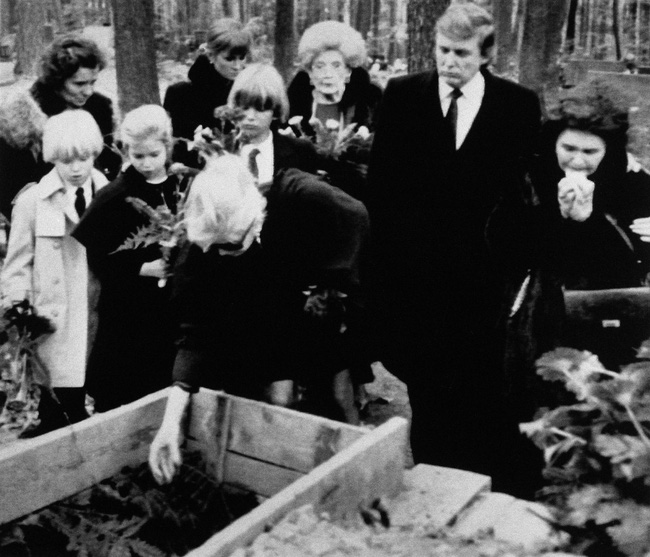 Hình ảnh được ghi nhận trong đám tang cha của bà Ivana Trump. Từ trái sang phải: Những người con của ông Trump gồm Eric (6 tuổi), Ivanka (8 tuổi) và Donald Trump Jr. (12 tuổi), vợ Ivana và ông Donald Trump.