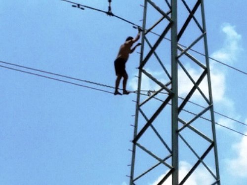 Nam thanh niên còn “diễn” màn đi trên dây điện cao thế 110kV, trước khi leo lên đỉnh trụ điện (cách mặt đất khoảng 40 mét) và ngồi tại đây. Lực lượng chức năng buộc phải cắt điện và dùng thang cứu hộ giải cứu nam thanh niên.