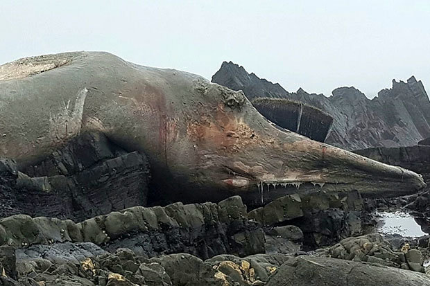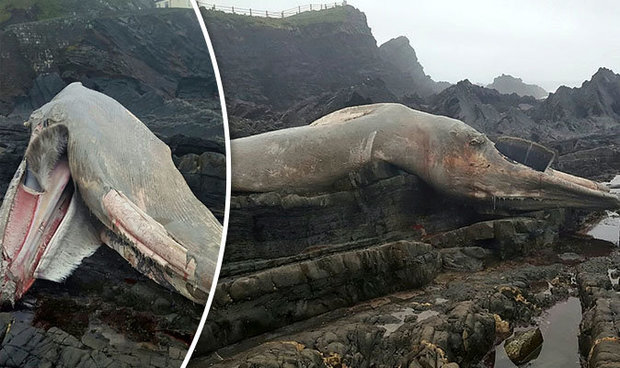 "Quái vật" to bằng một chiếc xe bus 2 tầng gây xôn xao là một con cá voi khổng lồ. Nó bị sóng đánh vào bờ và nằm chết trên những tảng đá gần Hartland Quay ở Devon.
