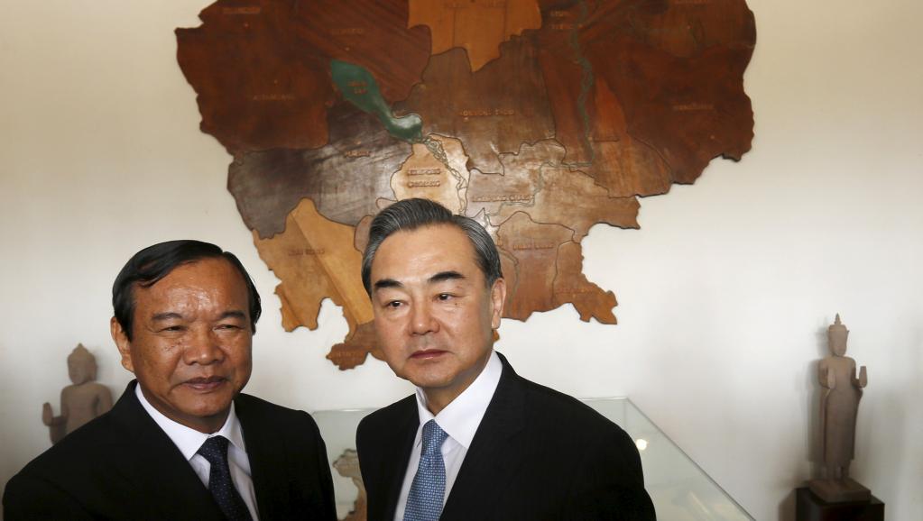 Ngoại trưởng Trung Quốc Vương Nghị (P) và đồng nhiệm Cam Bốt Prak Sokhonn . Ảnh chụp trước cuộc họp tại bộ Ngoại Giao Cam Bốt, ngày 22/04/2016.