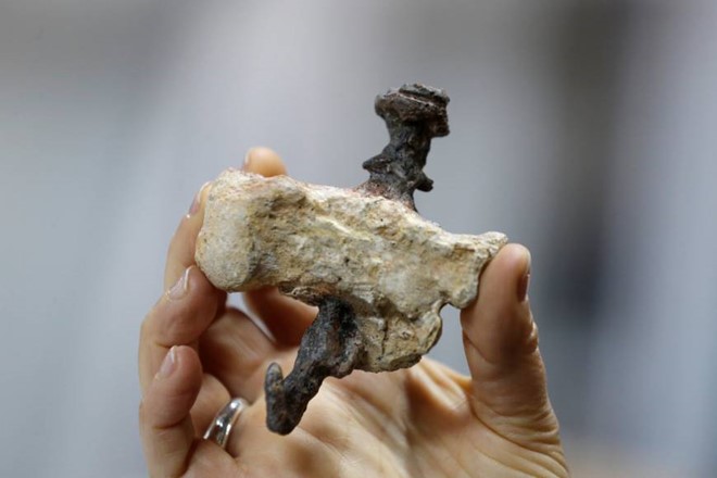 Bản sao của xương gót chân bị đinh đóng xuyên qua từ thế kỷ I sau Công nguyên, là bằng chứng duy nhất được tìm thấy về hình phạt đóng đinh thời Chúa Jesus. Ảnh: Reuters.