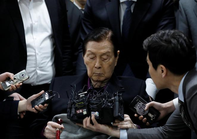 Nhà sáng lập 94 tuổi Shin Kyuk-ho của tập đoàn Hàn Quốc đã nổi nóng, ném gậy xuống sàn nhà sau khi bác bỏ các cáo buộc.