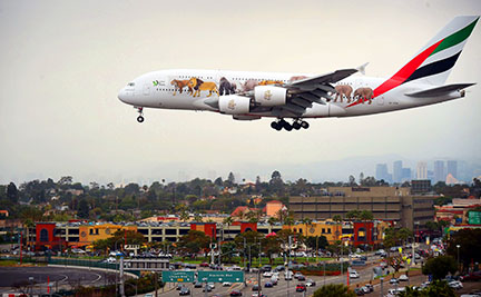Một chiếc phi cơ của Hàng Không Emrirates Airlines từ Dubai, Trung Đông đang chuẩn bị hạ cánh tại Phi Trường Quốc Tế Los Angeles vào ngày thứ Ba. Trước đây, nhằm ngăn chặn nạn khủng bố sau ngày 11 tháng 9, 2001, chính phủ Mỹ đă cấm hành khách không mang kem đánh răng, dao, kéo lên máy bay. Nay có thêm lệnh cấm cầm theo máy chụp h́nh, laptop và một số máy điện tử khác trên các chuyến bay xuất phát từ Trung Đông và Phi Châu. (Frederic J. Brown/ Getty Images)