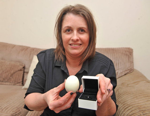 Sally Thompson ở Cumbra (Anh) vô cùng vui mừng khi ăn trứng gà bắt được cả viên kim cương ở trong đó. Sally Thompson mua quả trứng là tình cờ và cô coi đây là điềm báo vui mừng cô chuẩn bị lấy chồng. Và nguồn gốc của viên kim cương cuối cùng cũng đã được làm rõ.