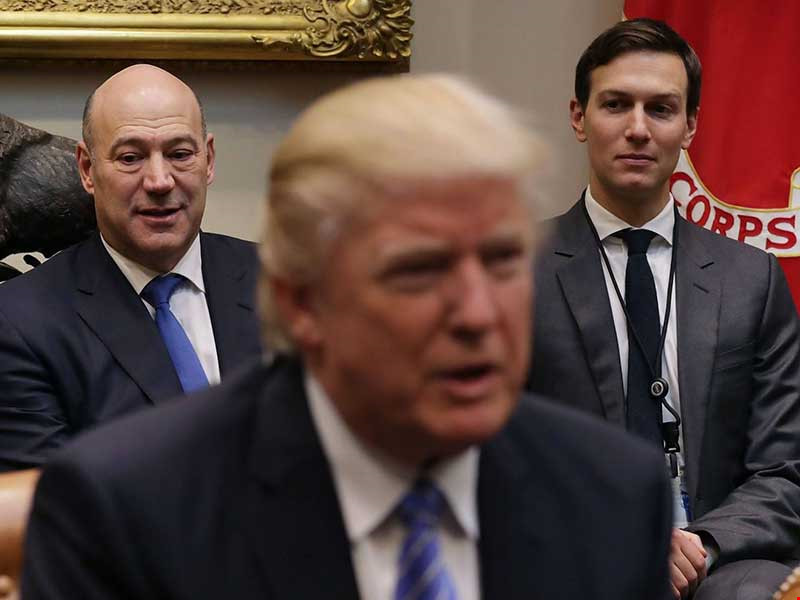 Giám đốc Hội đồng Kinh tế quốc gia Gary Cohn (trái) và con rể ông Trump, Jared Kushner (phải), trong một buổi họp báo của Tổng thống Trump tại Nhà Trắng ngày 23-1. Ảnh: GETTY IMAGES