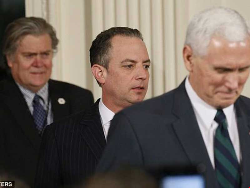 Ông Bannon (trái) và ông Priebus (giữa) quyết định liên minh đối phó “nhóm New York”. Ảnh: REUTERS