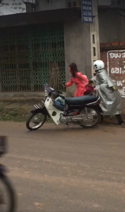 Chàng trai liên tục năn nỉ thuyết phục cô gái đội mũ và ngồi lên xe nhưng cô gái thì cương quyết không đồng ý, liên tục cáu gắt và gạt tay chàng trai ra xa mình.