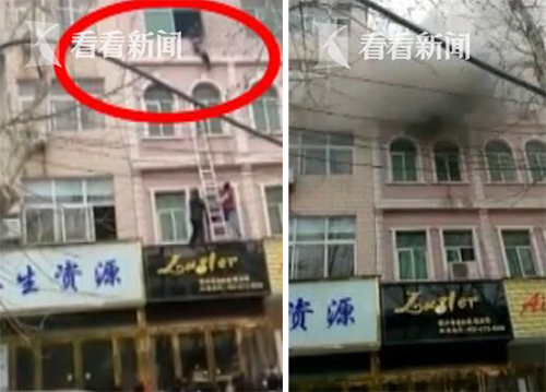 Đứa trẻ nắm tay ông lơ lửng ngoài cửa sổ căn hộ bị cháy. Ảnh: Global Times
