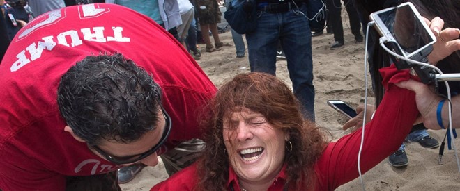 Los Angeles Times đưa tin một người biểu tình phản đối Trump bị cáo buộc sử dụng bình xịt hơi cay đã bị một nhóm người ủng hộ Trump đánh đấm túi bụi trên bãi cát.