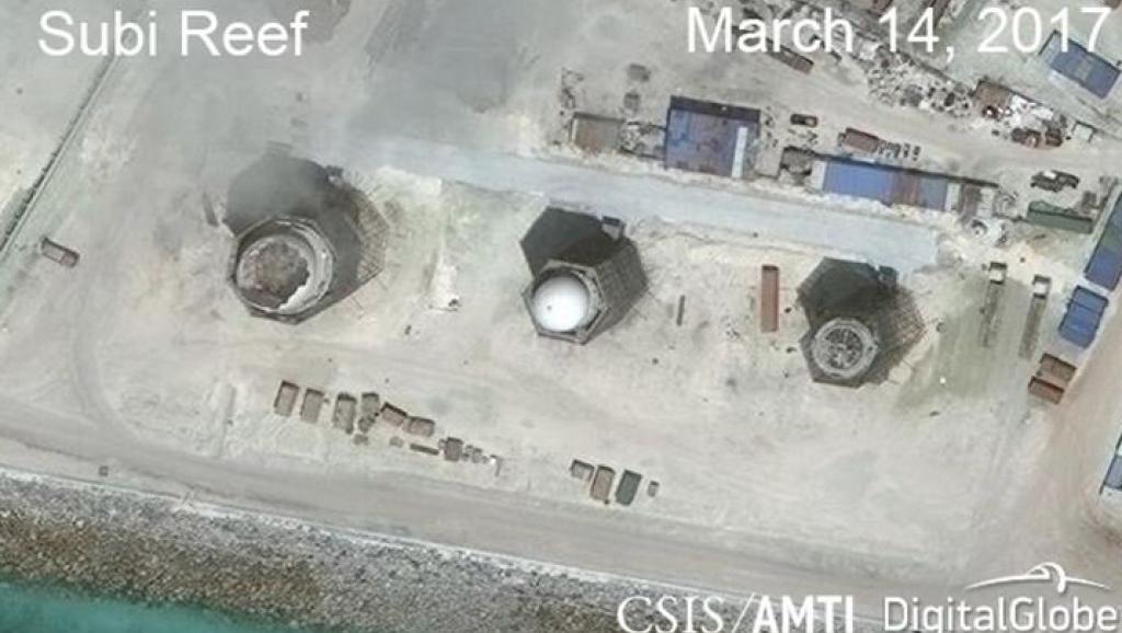 Ảnh vệ tinh do AMTI công bố ngày 14/03/2017 cho thấy các căn cứ mà Trung Quốc xây dựng trên đá Subi, Trường Sa, Biển Đông