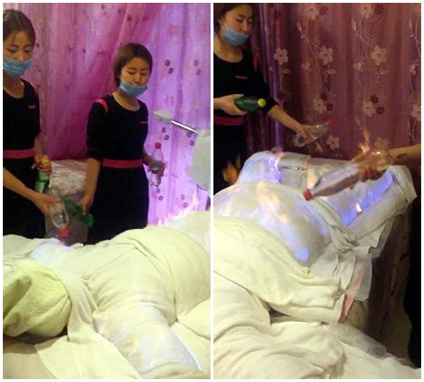 Khách hàng cần phải cởi hết quần áo và duỗi thẳng chân tay trên chiếc bàn trị liệu chuyên dụng. Tiếp đến, các nhân viên sẽ bọc hai lớp khăn ẩm lên cơ thể của khách trước khi xịt một thứ chất lỏng được chứa trong những chai nhựa không nhãn mác vào phần cần đốt mỡ.