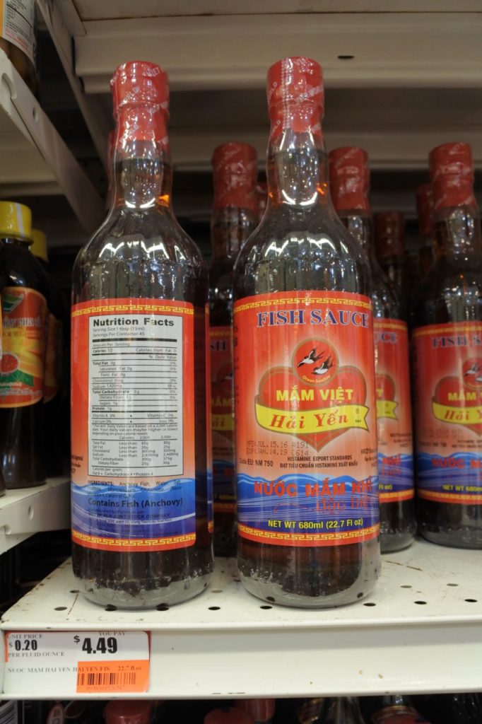Tôi tìm đỏ mắt mới thấy một chai nước mắm “made in Vũng Tàu, Việt Nam” là Mắm Việt Hải Yến với giá hơn 4 Mỹ Kim nhưng than ôi, đọc kỹ thành phần hoá ra cũng chỉ là một loại “nước chấm”! Không hiểu các nhãn hiệu nước mắm truyền thống sản xuất tại Việt Nam đi đâu hết mà không thấy xuất hiện ở đây?