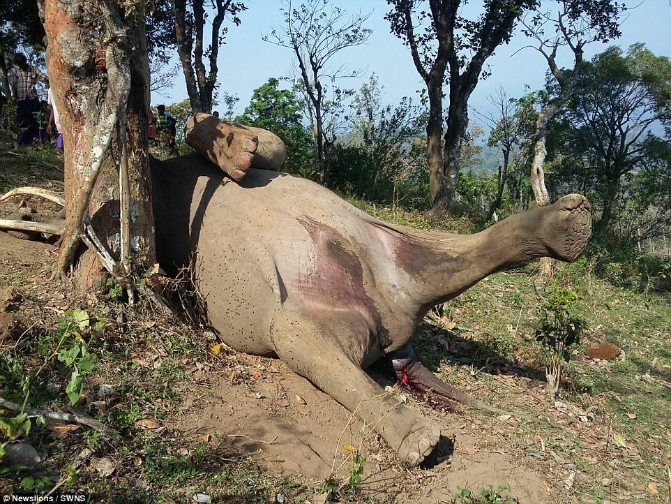 Những bức ảnh dưới đây cho thấy một con voi chết thảm trên mặt đất sau khi bị mắc kẹt chân vào chạc cây mít.