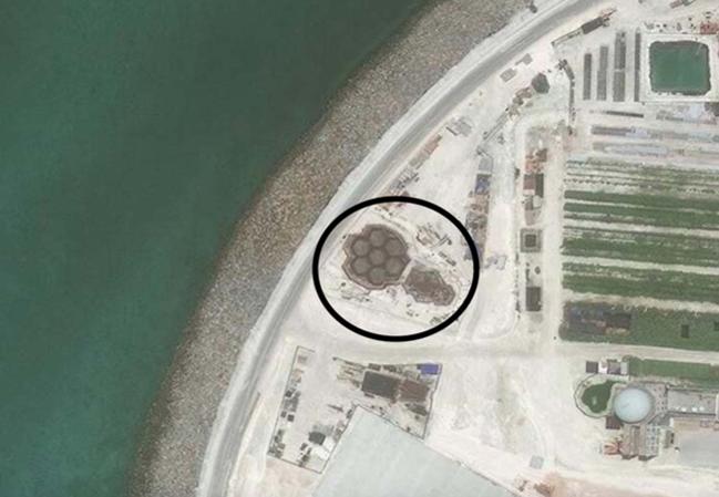 Cận cảnh một cấu trúc xây dựng trên đá Subi ở quần đảo Trường Sa đã bị Trung Quốc bồi lấp, xây dựng thành đảo nhân tạo phi pháp với đường băng, nhà chứa máy bay và các công trình quân sự kiên cố