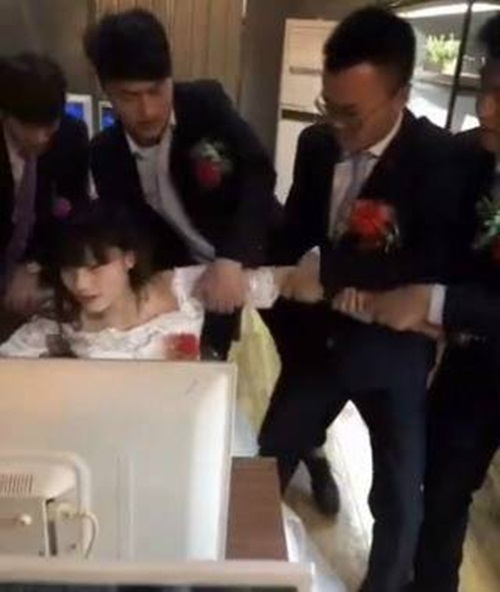 Một người dùng mạng chứng kiến cảnh đó kể lại rằng: "Chú rể cầm cánh tay cô dâu nói giọng khẩn cầu: Em đừng đùa nữa, đi về nhà kết hôn đã". Tuy nhiên cô dâu vẫn một tay cầm chặt con chuột máy tính để chơi, tay còn lại gạt chú rể ra và liên mồm nói: "Anh buông ra".