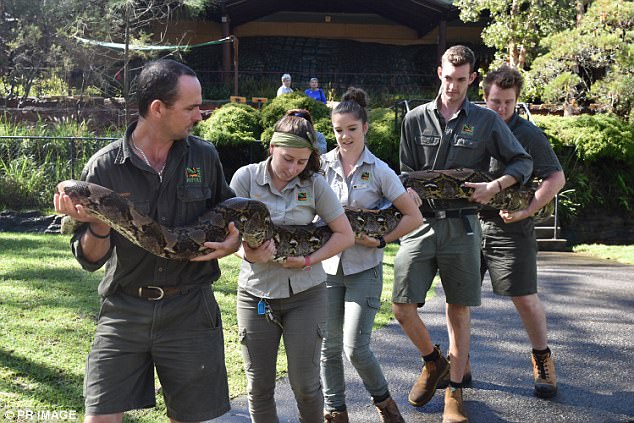 Để bế được con trăn dài quá khổ cần tới 5 nhân viên vườn thú. Việc đo chiều dài con trăn khủng cũng gặp nhiều khó khăn do kích thước của nó quá lớn và da trơn nhẵn.