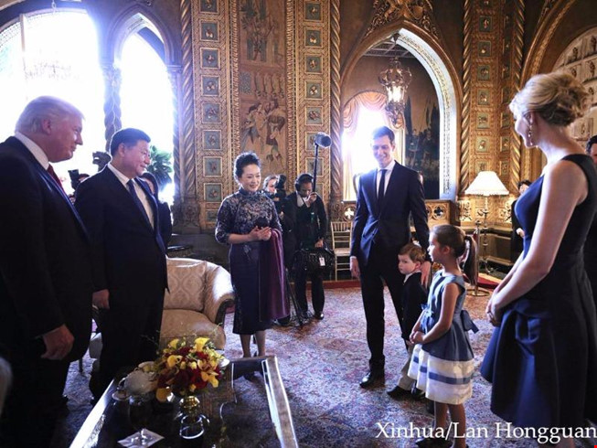 "Chúng tôi muốn ngài cảm thấy như ở nhà", Ivanka nói với ông Tập khi cô và chồng giới thiệu hai con. Lúc hai bé tới, Tổng thống Trump nói: "Đây là chủ tịch Trung Quốc". Ông Tập và phu nhân Bành Lệ Viện nghiêng người chào.