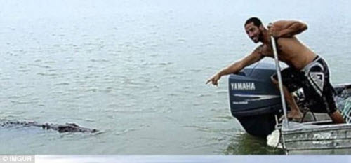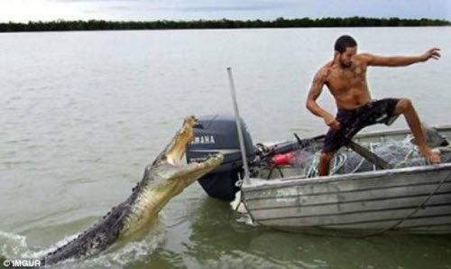 Con cá sấu khổng lồ sau đó bất ngờ lao khỏi mặt nước để đớp du khách, khiến anh này phải vội nhảy khỏi thuyền.