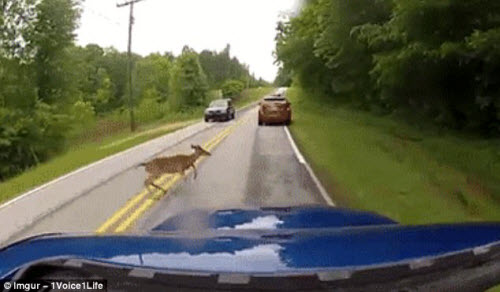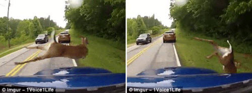 Con hươu kịp nhảy qua ca-pô ô tô và bay sang đường an toàn.