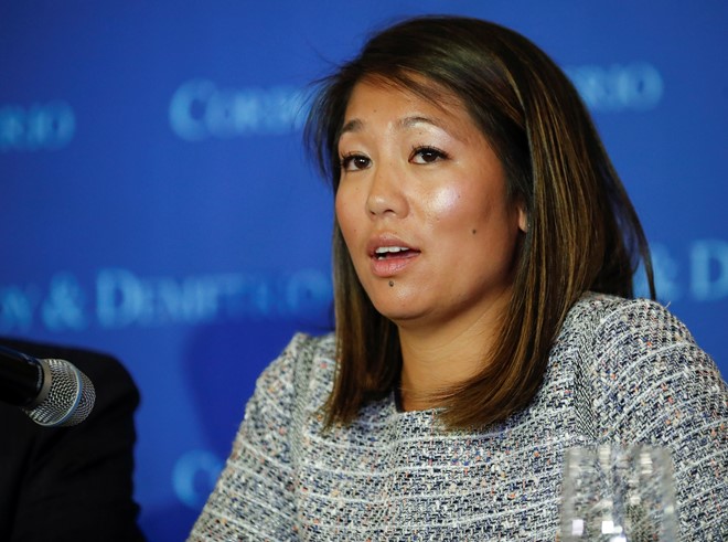 Crystal Dao, con gái ông David Dao, trong buổi họp báo ngày 13/4. Ảnh: Reuters.