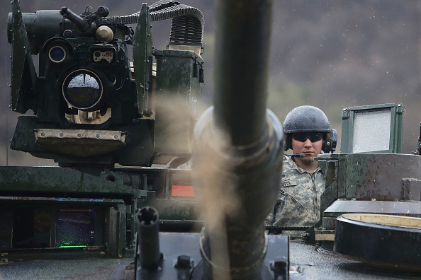 Một trong các quân nhân Hoa Kỳ đang dự một cuộc tập trận sát biên giới Nam và Bắc Hàn tại Paju, Nam Hàn ngày thứ Sáu. Tình hình tại bán đảo Triều Tiên đang gia tăng căng thẳng, với Hoa Kỳ đã đưa một hạm đội đến vị trí có thể tấn công vào lãnh thổ Bắc Hàn, cùng lúc cộng sản Bình Nhưỡng đã tuyên bố những lời thách thức Mỹ, đồng thời có thể thử nghiệm vũ khí hạt nhân hoặc bắn hỏa tiễn nhân dịp mừng sinh nhật lãnh tụ Kim Nhật Thành trong ngày thứ Bảy và cuối tuần này. Cho dù có một cuộc tấn công từ phía Mỹ, như vừa xảy ra ở Syria và A Phú Hãn, các phân tích gia cho rằng hậu quả sẽ đi từ tệ đến tệ hơn qua các lựa chọn của quân đội Hoa Kỳ. (Chung Sung-Jun/ Getty Images)