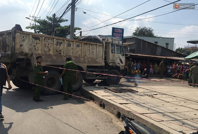 Tại hiện trường, xe đạp bị xe ben cán bẹp dí, thi thể người phụ nữ nằm sát bên chiếc xe đạp.