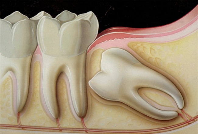 - Răng đã hoàn thiện dưới nướu nhưng không đủ không gian để mọc ra, răng liền kề đã choán hết không gian của nó. Trong trường hợp này, nếu răng khôn vẫn cố "ngoi" lên thì sẽ làm hỏng chiếc răng lân cận.