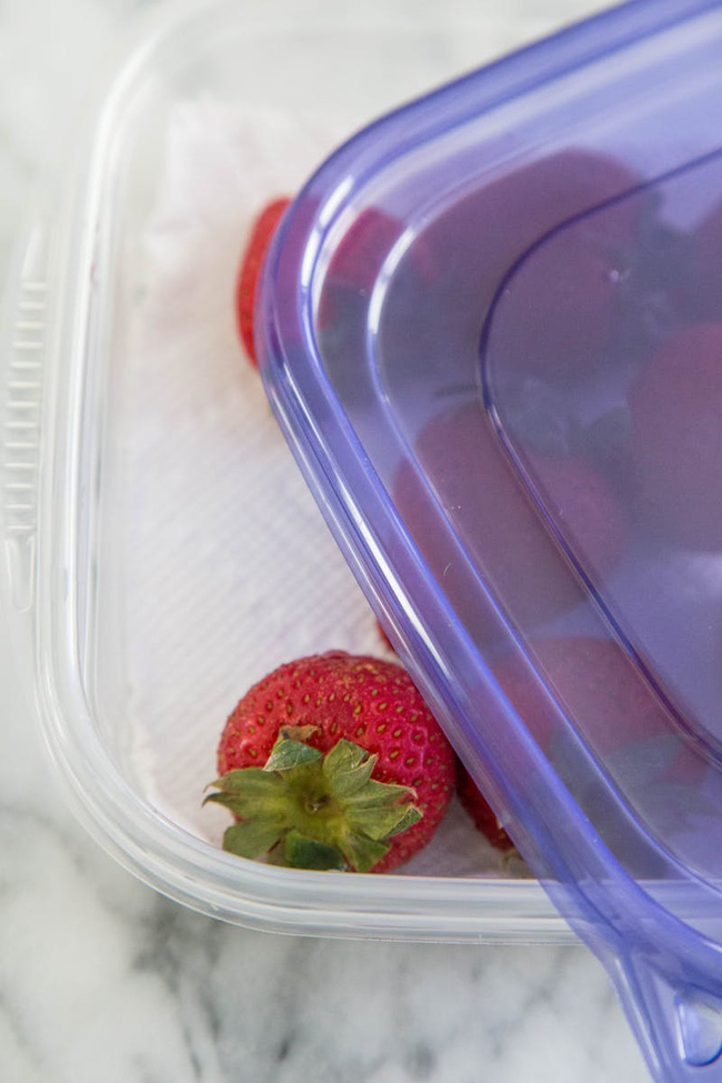 Lót hộp nhựa bằng khăn giấy, sau đó cho dâu vào đậy kín, bảo quản trong tủ lạnh (ngăn đông càng tốt).