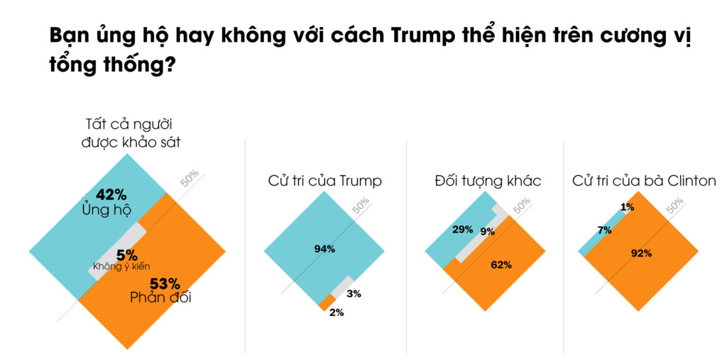 Trong khi đó, đến 92% cử tri đã bầu chọn bà Hillary Clinton không ngần ngại thể hiện quan điểm chống đối. Tuy nhiên, tỷ lệ không đồng tình với Trump vẫn rất cao ở những nhóm cử tri bầu cho các ứng viên những đảng khác.