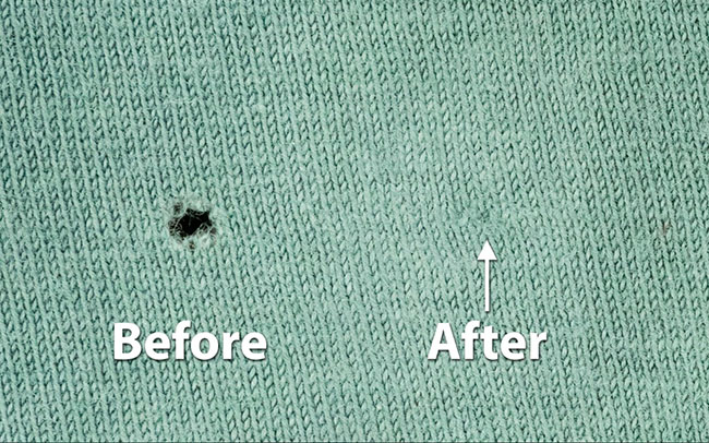 Xong! Bây giờ, bạn hãy lộn mặt phải của chiếc áo ra và có thể thấy lỗ thủng đã biến mất hoàn toàn rồi!