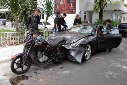 Chiếc xe Ferrari bị hư hỏng nặng được tìm thấy trong khuôn viên gia đình Vorayuth Yoovidhaya năm 2012. Ảnh: Reuters