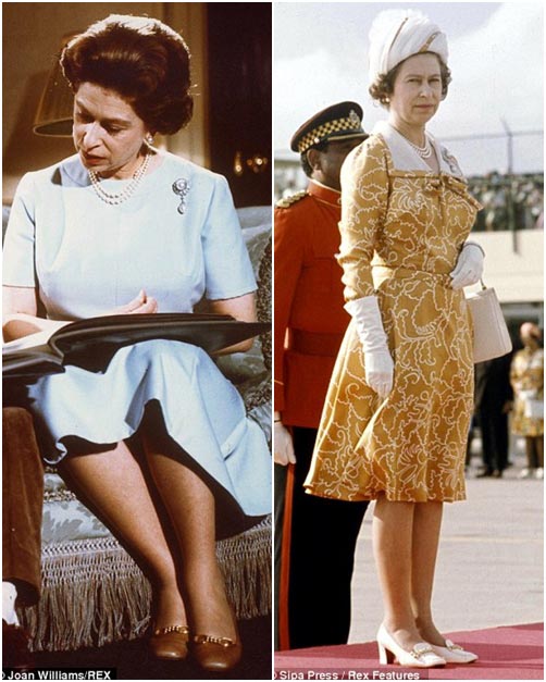Đôi giày Rayne được Nữ hoàng đi vào năm 1969 với màu da nâu và thiết kế lưỡi giày ngắn (ảnh trái). Bức hình bên phải ghi lại mùa hè Jamaica 1975 của Nữ hoàng Anh trên đôi giày quen thuộc trong gam màu trắng.